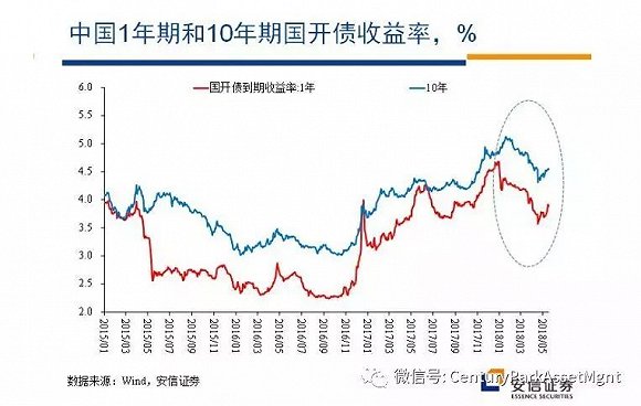 企业融不到资的后果就是跑去境外去融资,后果就是尽管美元兑主要货币的汇率在上升,但是人民币兑一揽子货币却在升值,这肯定不是因为中国经济出现较大的好转,而是因为境内信贷市场塌方,企业去海外借钱,导致有大量外汇流入,推升RMB升值。这个理论上必然导致中国GDP的收缩,也从理论上容易导致去杠杆越去越多。信用市场出现塌方,而信贷以外的科目没办法融资那资金去了哪里呢?对于银行体系,资金无处可去的话,这部分资金就回流到了债券市场。这就导致了信用市场的利率在上升,而高等级的债券的利率在下降,两个市场之间出现了跷跷板。