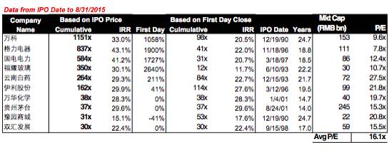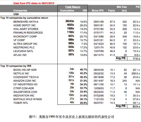 同期的或者早期的美国,一些公司大家也耳熟能详,伯克希尔Berkshire从1958年上市到现在涨了26000倍,IRR都是相当的,同时在美国上市的百度、携程,IRR增长最快的好几个都是中国公司(参见图11)。