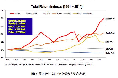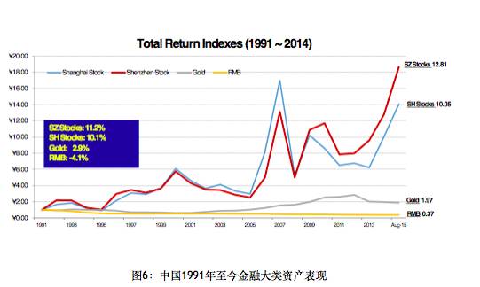 首先我们还是用数据来说话。我给大家看一下我们能够搜集到的过去的数据,对中国股市和其他市场的表现做一个比较。图5是美国从1991年底到去年底的数据,我们看到其表现几乎和过去两百年的模式是一样的,股票的投资在不断地增加价值,而现金在不断地丢失价值,这都是因为GDP的不断增长,和过去两百年基本上是一样的。