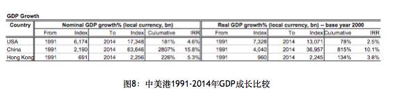 我们看到的结果是,中国在过去二十年里的模式(Pattern)几乎和美国过去两百年是一模一样的。1991年至今的大类资产中,同样的一块钱现金变成4毛7,跟美金类似,黄金当然是一样的,上指、深指一直在增加,固定收益的结果基本也是增加。但不同的是,它的GDP发生了很大的变化。因为GDP的变化,它的股指、股票的表现更加符合GDP的表现。也就是说,比美国要高。在这样一个不发达的国家,我们居然看到了这样一个特殊的表现形式。我们看到的是在过去几十年里,第一,它的基本模式和美国是一样的;第二,它基本的动力原因也是GDP的增长。由于中国的GDP增长在这个阶段高于美国,直接导致的结果是它的通货膨胀率也高,现金丢失价值的速度也高,股票增长价值的速度也高。但是基本的形式一模一样。这就很有意思了。