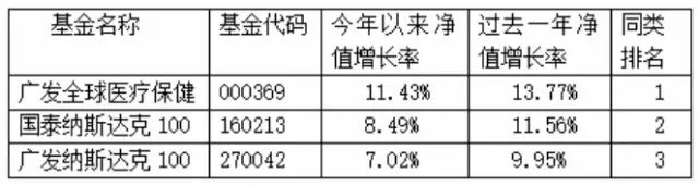 银河基金的统计数据显示,截至8月28日,指数股票型基金今年以来净值增长率排在前三位的基金分别是广发全球医疗保健指数、国泰纳斯达克100指数、广发纳斯达克100指数,今年以来的净值增长率分别为11.43%、8.49%、7.02%。其中,有两只是广发基金旗下的QDII基金。