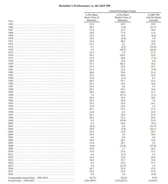 长期来看,1965-2018年,伯克希尔的复合年增长率为18.7%,明显超过标普500指数的9.7%。1964-2018年伯克希尔的整体增长率是1091899%(即10918倍以上),而标普500指数为15019%。